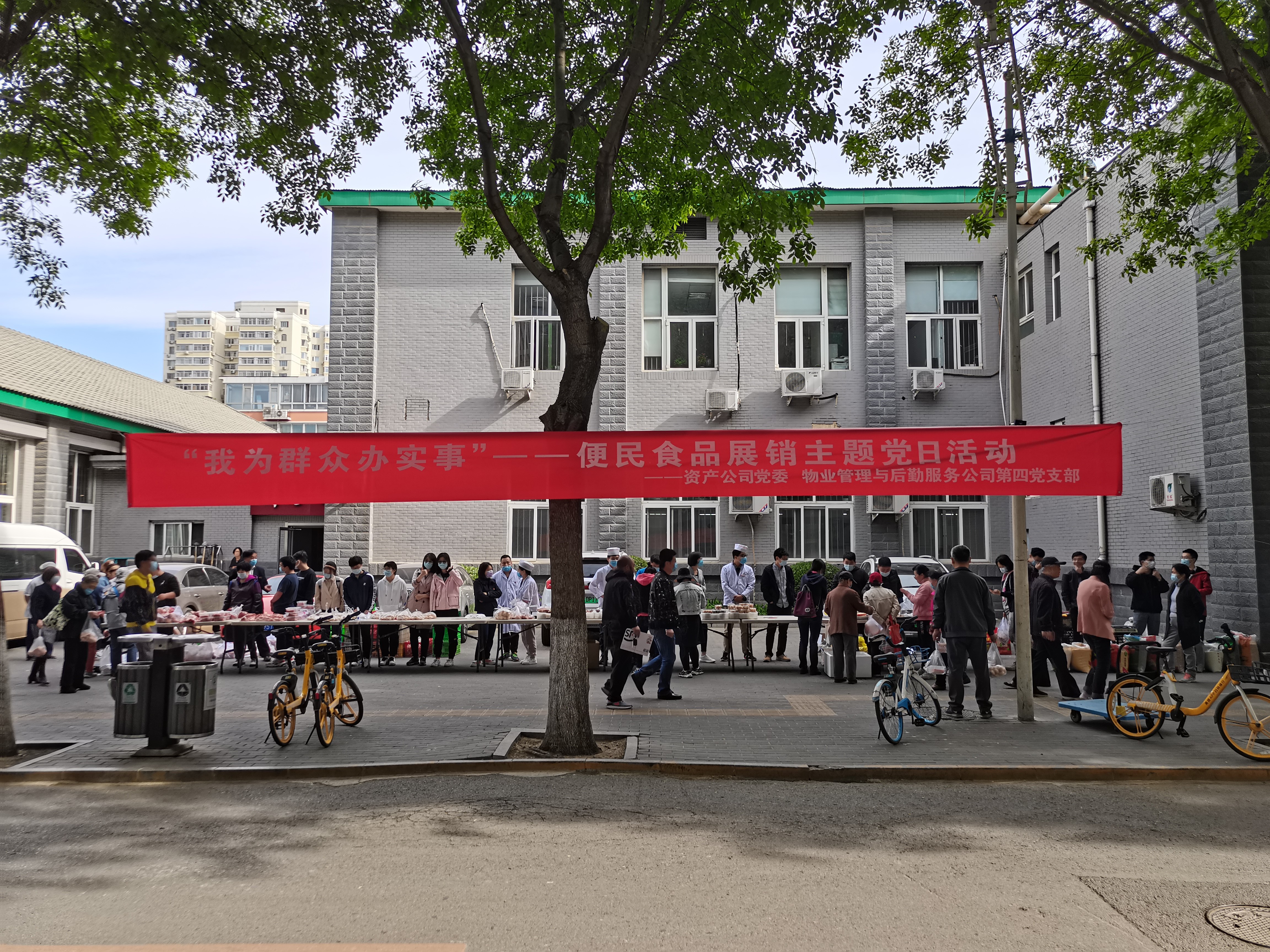 4月28日清晨,本科生党支部与物业管理与后勤服务第四党支部,在中关村校区社区内共同开展便民食品展销,为社区居民提供优质放心食品、便利快捷服务。服务期间,帮助食堂员工售卖,为行动不便的老人送货上门,服务和态度得到了工作人员与社区居民的充分赞誉。