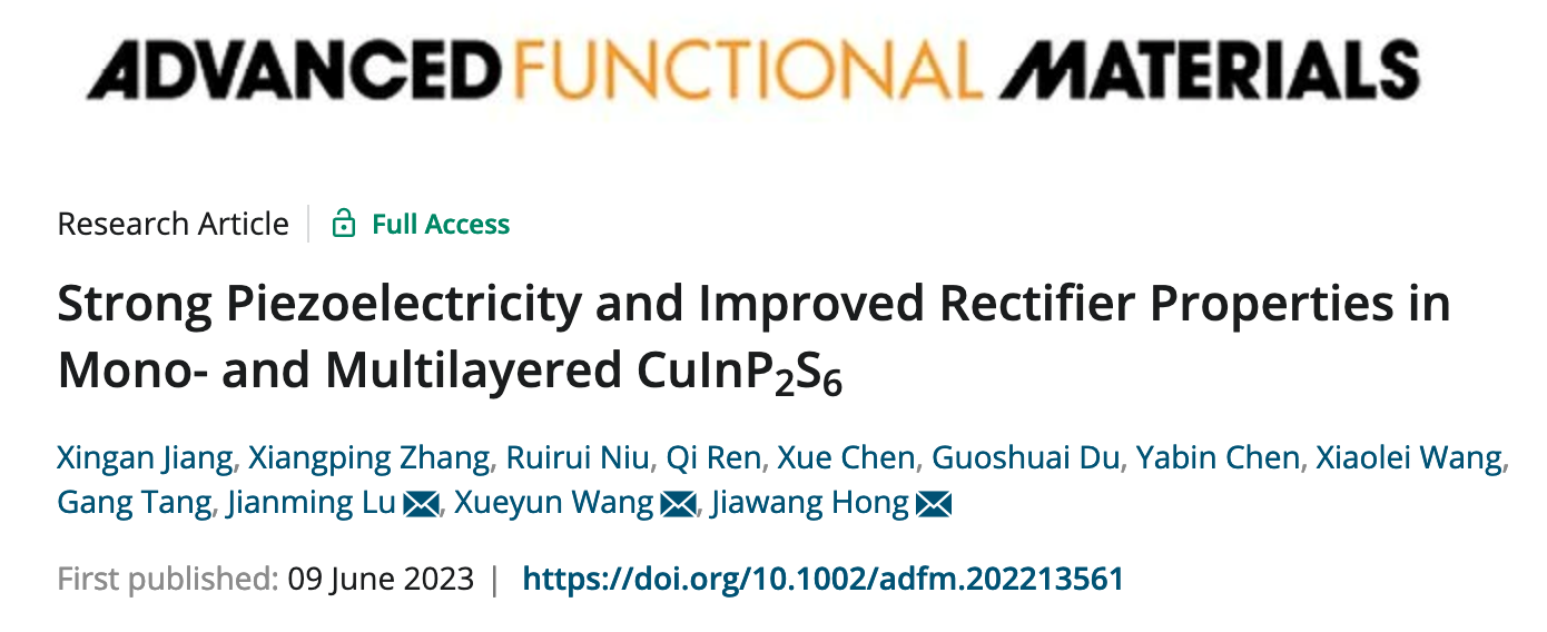 近日,bw必威西汉姆联官方网站betway西汉姆联官网洪家旺教授、王学云副教授团队报道了单原子层厚度的二维范德瓦尔斯CuInP2S6铁电材料面外强压电性效应以及增强的电流自整流特性,相关成果以“Strong Piezoelectricity and Improved Rectifier Properties in Mono- and Multilayered CuInP2S6”为题,发表于国际顶级学术期刊《Advanced Functional Materials》。