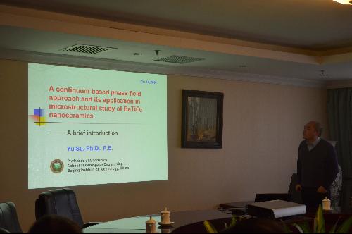 16日,Wang教授与学院师生进行了更为深入的学术交流。同时北京工业大学张伟教授、杨晓东教授等也参与了学术交流。上午张伟教授做了题为“动力学与控制学科发展与人才队伍建设”的报告,北理工betway西汉姆联官网苏煜教授做了题为“A continuum-based phase-field approach and its application in microstructural study of BaTiO3 nanoceramics”的报告,田强副教授做了题为“空间结构展开动力学并行计算研究”的报告;下午马艳辉博士做了题为“The Mechanical Properties of a Tree-dimensional Stochastic Firbrous Network with Cross-linking”的报告。刘晓宁副教授做了题为“Chiral elastic metamaterials and Micropolar model of 2D chiral solids”的报告,周萧明副教授做了题为“波控超材料的力学设计与潜在应用”的报告。博士生Oyelade做了题为“negative stiffness in chain of oscillators”的报告。报告之后均进行了热烈讨论,激发了与会专家和学生的思考与交流。